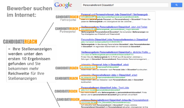 - Durch die kombinierte Nutzung der Suchmaschinen-Optimierungsaktivitäten der jeweiligen Jobportale steigt die von den Suchmaschinen wahrgenommene Relevanz der geschalteten Stellenanzeige signifikant mit der Folge, dass die geschaltete Stellenanzeige in der Ergebnisanzeige bei einer Google-Suche höher gerankt wird.